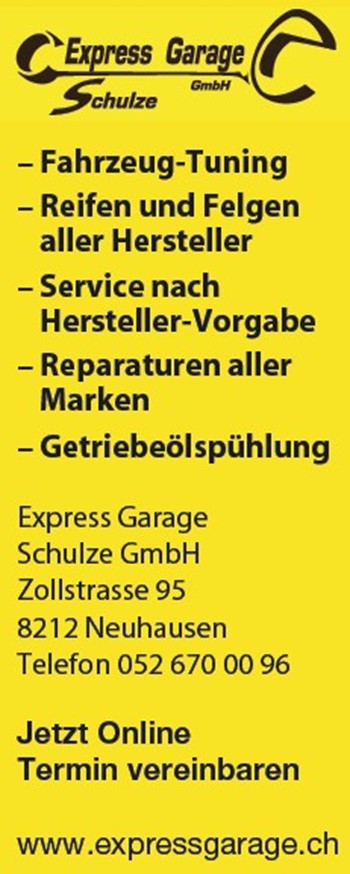 Express Garage Schulze GmbH Zollstrasse 95 | 8212 Neuhausen am Rheinfall Tel. 052 670 00 96 | www.expressgarage.ch Mehr Infos